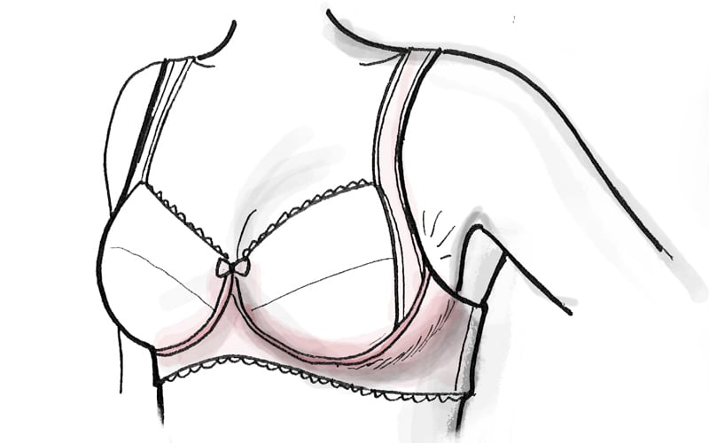 Hvis brystet presses mot armhulene, har du på deg for liten cupstørrelse. Cupene skal omfavne hele bredden på brystene. Her kan imidlertid brystenes posisjon og form spille en rolle. Hvis du har en bred brystbase eller hvis brystene er plassert langt fra hverandre, kan brystvevet være naturlig nær armhulene. Hvis du er overvektig, kan brystvevet også smelte sammen med resten av kroppen og det kan dannes en ubehagelig pløse ved armhulene. Da foreslår vi en bh-modell med en ekstra sidevinger ved armhulene, den kan jevne ut pløsene og redusere ubehaget. Uansett, prøv å gå opp en cupstørrelse.