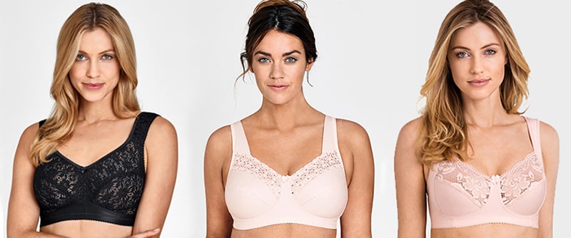 Fra venstre bøylefri komfort-bh Sleep & Relax i myk stretchblonde, Broderie Anglais i herlig bomull og Lovely Lace med sidestøtte